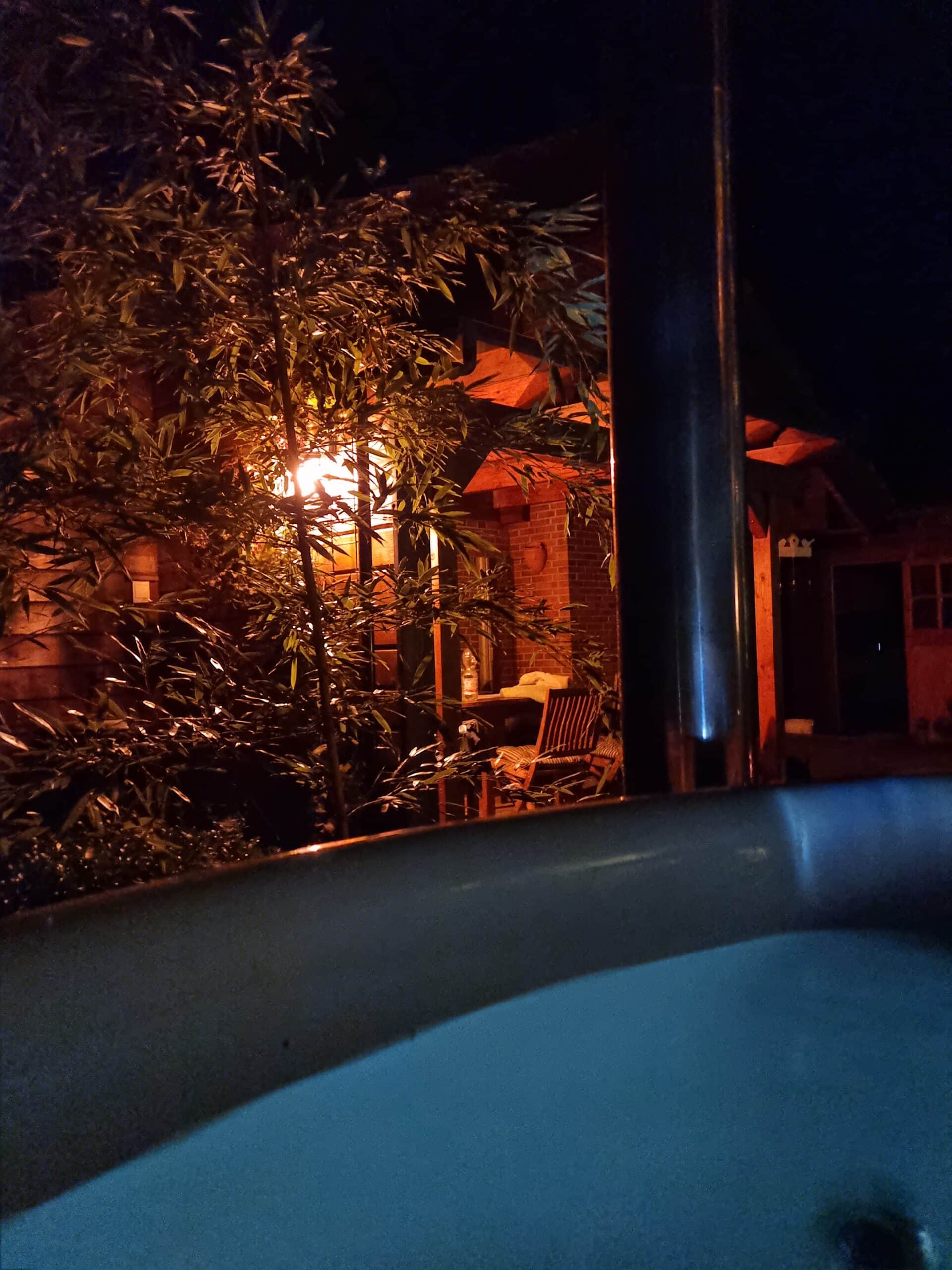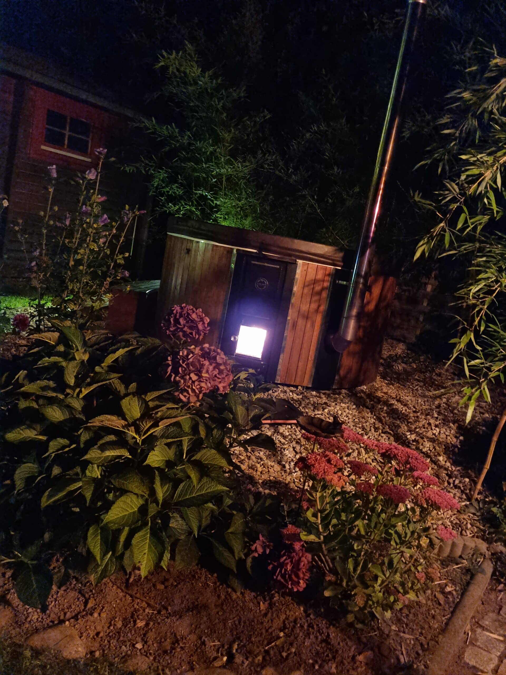 Im holzbefeuerten Hot Tub mit Unterwasserbeleuchtung und Whirlpool lässt es sich herrlich entspannen – auch unser Saunahäuschen lädt zum Entspannen ein.