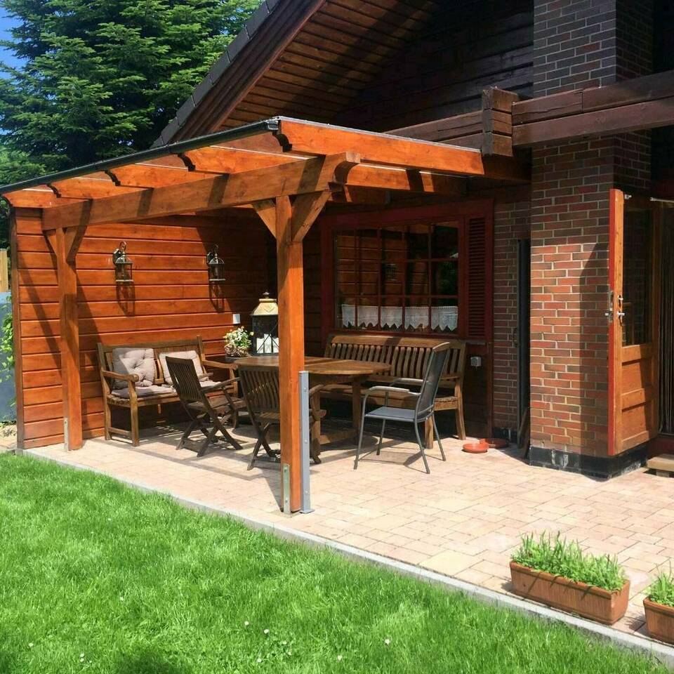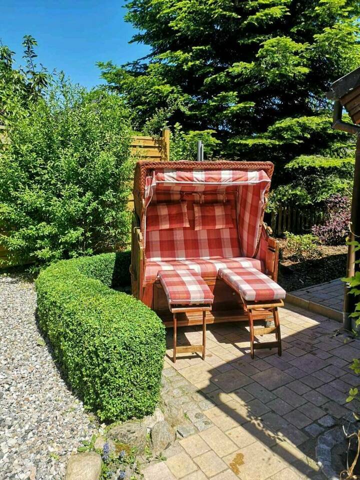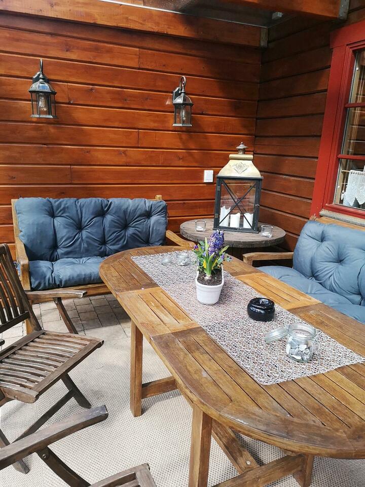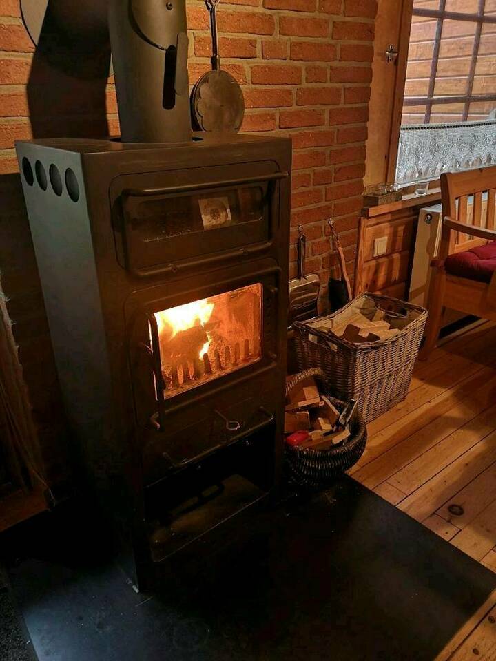 Im Sommer kannst Du herrlich auf der überdachten Terrasse frühstücken und im Winter verströmt der Bollerofen eine kuschelige Wärme.