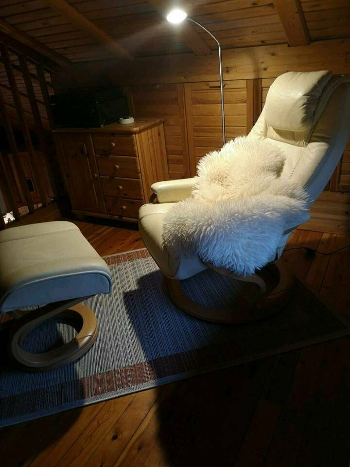 Die Treppe hoch befindet sich eine offene Empore mit einem gemütlichen Streßless-Sessel, in dem es sich wunderbar lesen oder entspannen lässt. Hier oben sind noch 3 weitere Schlafplätze.
